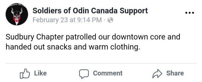We want to be a bit careful in how we present this. It is our opinion that propaganda is the main purpose of these street patrols, which are obviously more about intimidation than actually patrolling the street and are largely performative. As far as we know, they have been very infrequent, maybe once a month and have mostly consisted of the Soldiers of Odin walking around downtown for an hour or so handing out toques, mitts and Tim Hortons gift cards. The greater concern for us from talking to locals is that the Soldiers of Odin have been successful at stirring up fear.