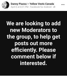 We don’t know too much about Danny yet so this post is going to be a bit of a call-out for any information our readers may have. We do know he knows Jeff Doyle though and in fact we did notice Doyle angling for a moderator position in the Yellow Vests Canada group a little while ago, which it turns out he was successful at.