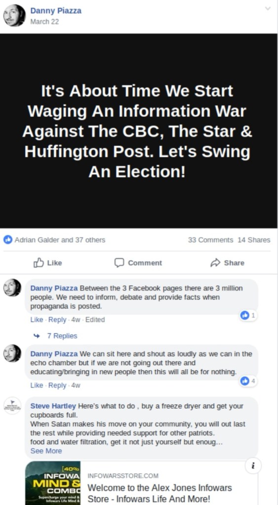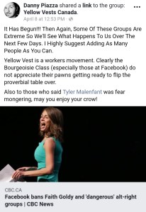 To start off, we need to give a little introduction to the Yellow Vests Canada group on Facebook. There’s many articles about the group and there’s even a whole project dedicated to monitoring and reporting on the disturbing content there where they do excellent work. This post is going to deal with two of the moderators of that group: Danny Piazza and a recent addition who will already be familiar to our readers, Jeff Doyle.