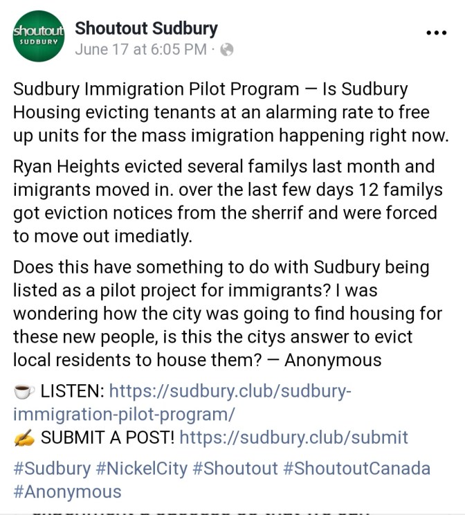 You may recall from a while back that there were a lot of shitty comments in response to a new pilot project to bring more immigrants to Sudbury. In particular there was this xenophobic post that was made anonymously, positing that residents of public housing were being evicted to make room for immigrants from this pilot project.