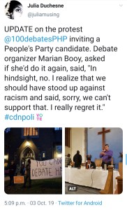 Let’s be clear here: The PPC should not be allowed at these debates at all. Everyone that we saw come out to support them were people associated with hate groups. The simple bottom line is that allowing the PPC at debates makes others unsafe and prioritizes the PPC and their supporters above others safety. This is true at both the macro level of public discourse and policy and the micro level of these debate events. The PPC and their supporters have no intention of reciprocating any respect and goodwill shown to them, as respect and goodwill are both absolute jokes to them.