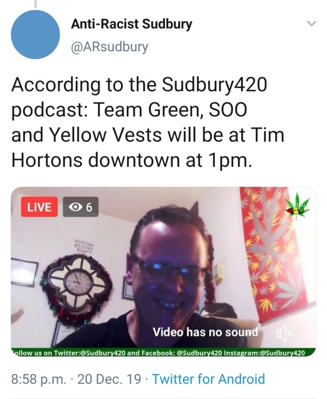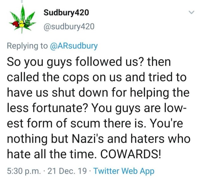 Jason/Sudbury420 took to Twitter to accuse of us calling the cops on them when: (1) It being a political gathering, (2) Having people wearing the same clothes assemble in a place where a high profile stabbing took place recently and (3) Jason’s own recent antics, had already made the odds of a police presence about 300%.