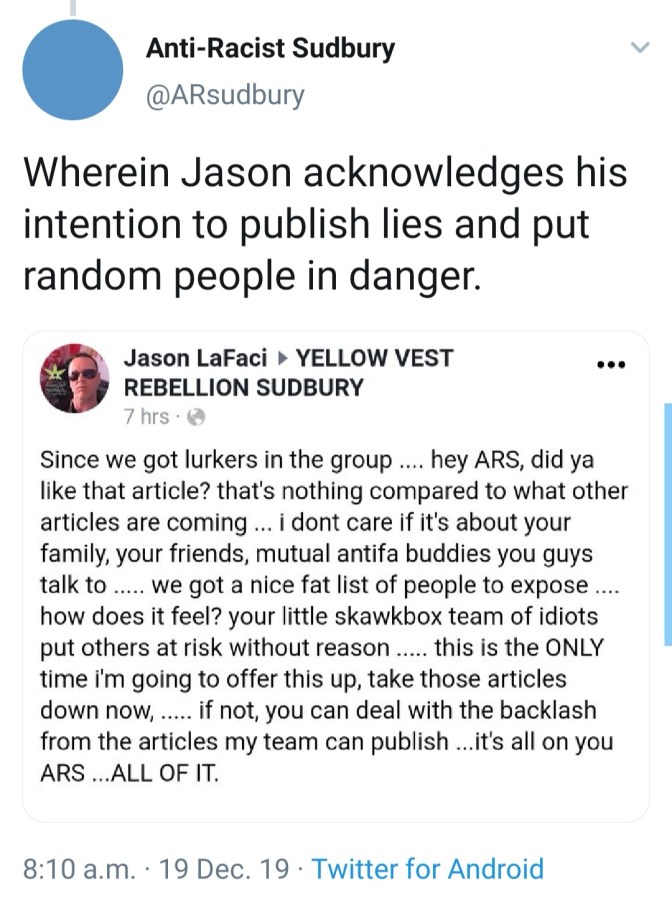 As we’ve mentioned previously, the far-right here in Sudbury have grown increasingly unhinged over the past few months; graduating from veiled threats to actually attempting to “out” us and basically just harassing anyone in the city who has claimed support for anti-fascism.