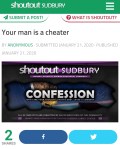Shoutout Sudbury is a local gossip site where users post anonymously. It is run by a man from Edmonton named Jody Mitoma and is part of a larger umbrella called Shoutout Canada.
