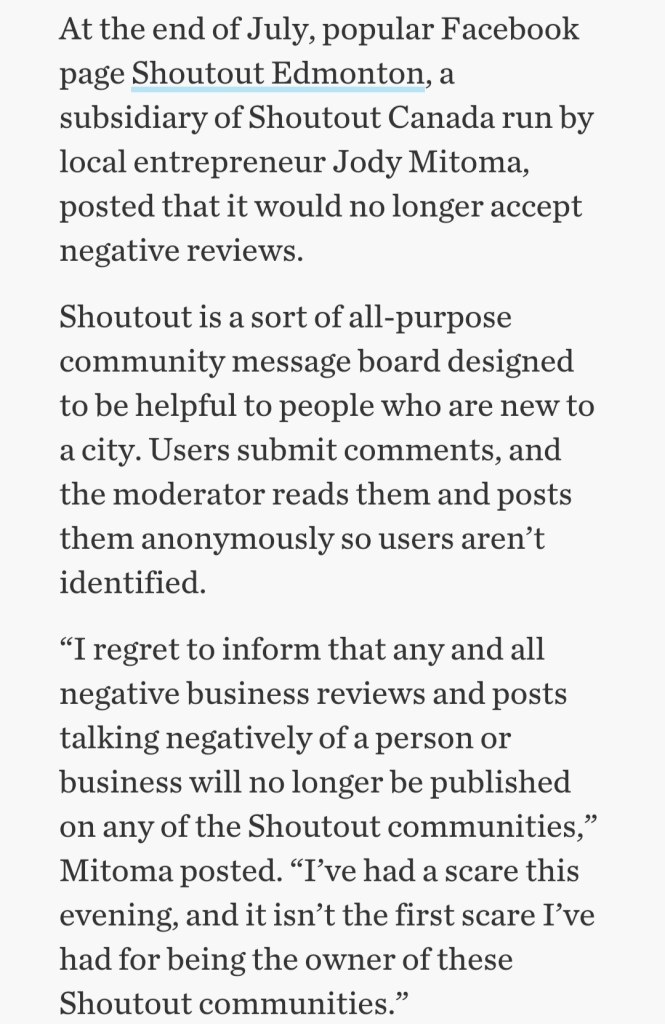 In addition, Shoutout Sudbury’s Terms and Conditions clearly state (bolded emphasis is ours): “Shoutout Canada reserves the legal right to refuse publicly posting anything negative about a specific person, group or business. We may edit your anonymous post before publicizing it (whether it be to remove a person’s name or company name) to refrain from libel.“