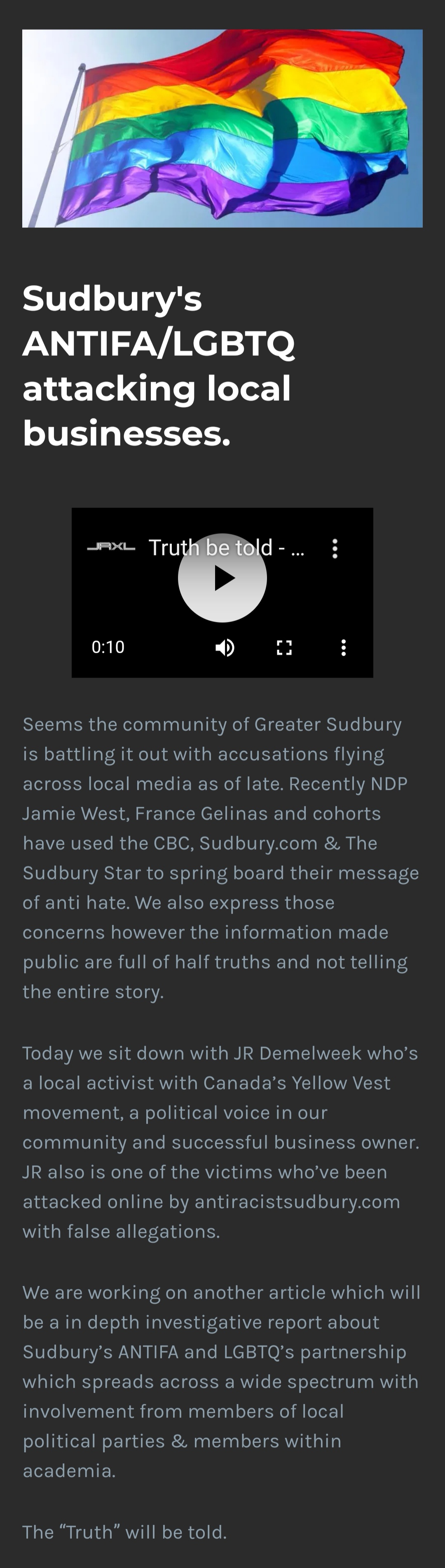 Members of Pride’s board are anti-fascist, they have publically opposed the far-right here in Sudbury, and accordingly, it is in the far-right’s interest to attack and try to delegitimize Fierte Sudbury Pride. Antifa (really, anyone who is not a fascist), Fierte Sudbury Pride and our own project Anti-Racist Sudbury have been completely conflated by the far-right.