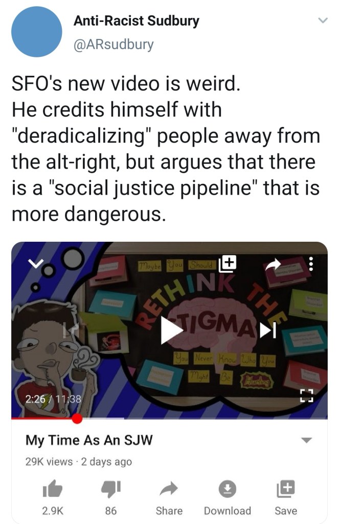 As we said above, the whole damn thing is really SFO describing how he was radicalized and self-servingly portraying this as him becoming more moderate. He denies being being part of a “pipeline” that radicalizes people when even a cursory look at the video’s comments shows that he obviously is.
