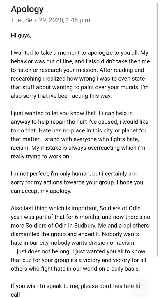 We received the following email from Jason. It was sent to us, BLM Sudbury and to the police; suggesting he had to prove to the police that he apologized.